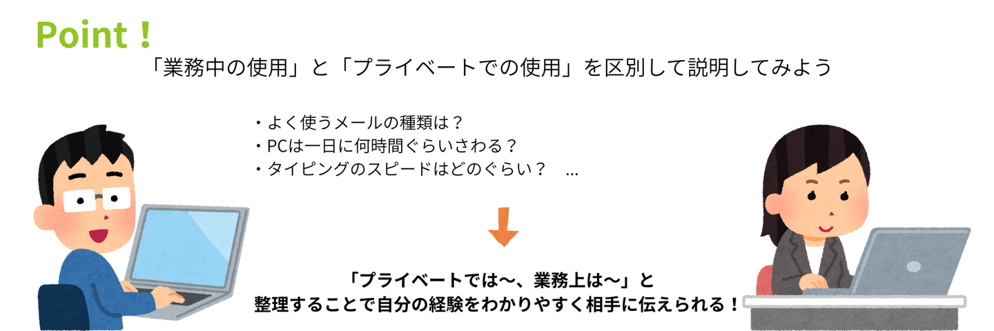 仕事やプライベートでPCを使っていたシチュエーションから使用頻度や経験を伝える