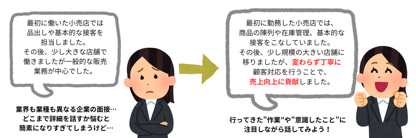 そんなときは一度、自分がこれまで行ってきたきた行動・作業・意識したことに具体性を持たせることを意識してみましょう!
