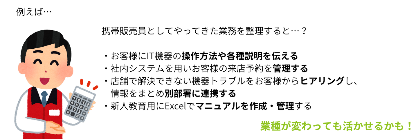 今まで自分が行ってきたことを一度客観的に分解してみることも重要です。何気なく行っていたことの中に自分の経験と説明できることはきっとあるはずです!