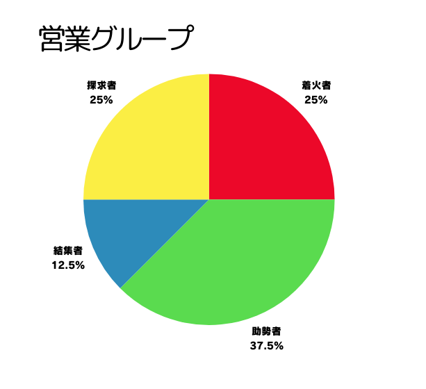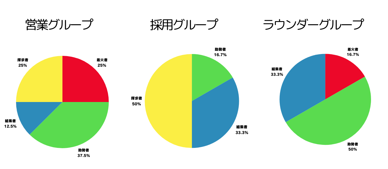 一番割合の多い助成者(緑)はチームを支えたり献身的な支援を行うポジションです。営業グループは一番クライアントと話す機会が多いグループのため、「いまの現場で何ができるのか」「自分は何を意識して仕事をすれば成長できるのか」一人で悩んでしまったときは相談してみましょう!