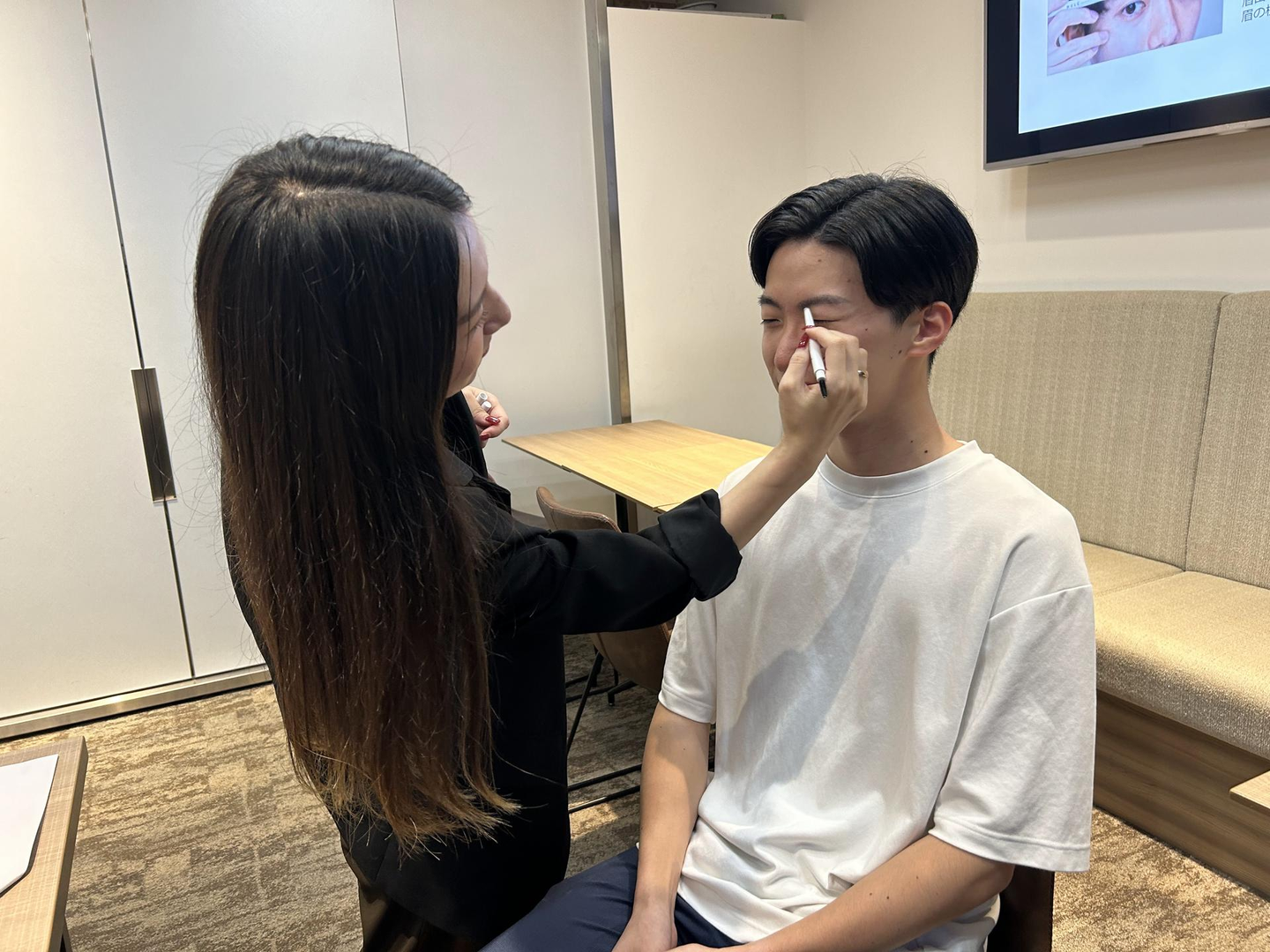 実際、営業クルーにモデルになってもらい、眉毛の書き方講座も行いました!