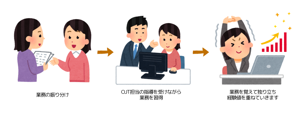 OJT(On the Job Training)研修は「今後実際に自分が携わる業務を本番環境で、手順書や先輩(上司)からの指導のもと覚え、独り立ちを目指していく」研修方法です。
