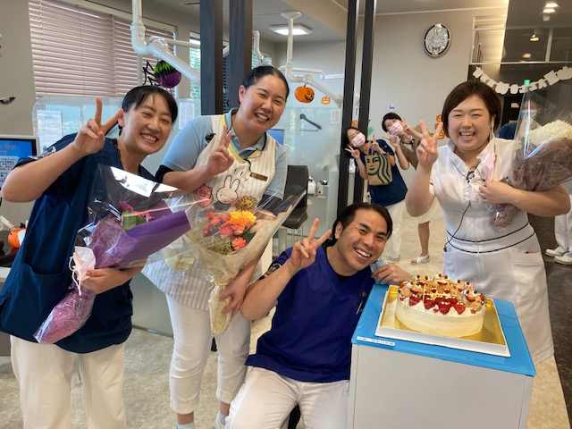 先日、10月のスタッフの誕生日会を開きました おいしそうなケーキ。お祝いの後でみんなでたべました。かわいいケーキです。 いつもお願いをしているケーキ屋さんの特注です。