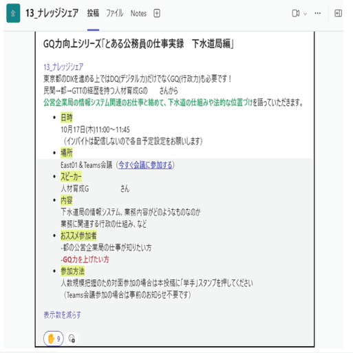また、開催自体はTeamsの財団内チャンネルで告知/参加表明ができ、話す側も聞く側もハードルをさげています。