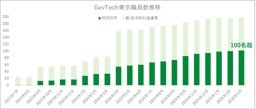 GovTech東京も、高度なデジタル人材を採用し、行政と民間がフラットに”協働”できる場として設立されました。実際にGovTech東京では2023年7月設立以降、既に100名超の民間人材を採用しています。