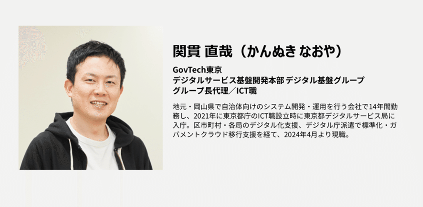 関貫:私は元々地元である岡山県にある自治体向けのシステム開発・運用を行う会社で約14年間、保険医療システムを担当していました。そんな中で宮坂さんからICT職の募集を開始するという発表があり、興味を持ったんです。そしてICT職の1期生として2021年に東京都のデジタルサービス局に入庁し、区市町村の手続きに関するBPR支援や都庁内各局のDX支援やデジタル庁への出向も経験しました。その後2023年8月にGovTech東京への派遣が決まり、今に至ります。