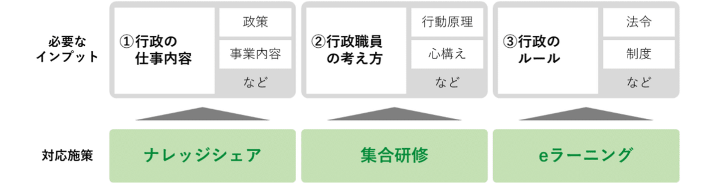 人材育成グループは、民間人材が行政で働く上で必要なインプットについて、①行政の仕事内容 ②行政職員の考え方 ③行政のルール、大きく3つを定義し、施策を検討・実施しています。