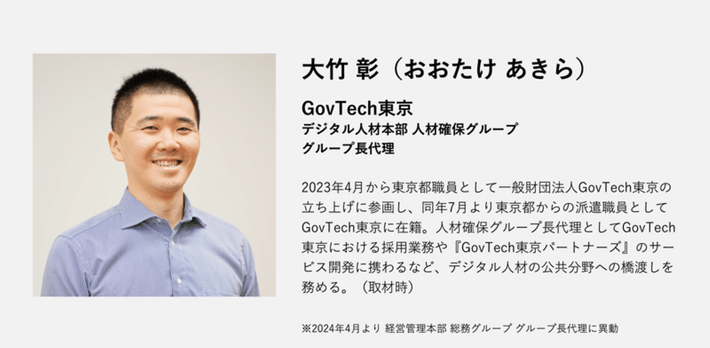 大竹:「GovTech東京パートナーズ」は、公共分野に興味をもつ、民間企業社員やフリーランスとして活躍するデジタル人材と、デジタル人材を必要としている都内62の区市町村等とのマッチングを実現するために、2024年度からスタートした人材紹介サービスです。