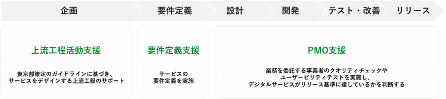 東京都では、ユーザー視点でサービスを企画・設計するために仕組化されたサービスデザインガイドラインが整備されています。私たちはそのガイドラインに基づき、サービスを企画・デザインする上流段階から関わることで品質向上に貢献しています。