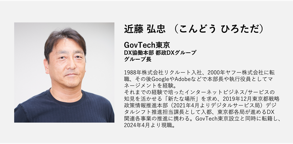 今回は、インターネットの黎明期からヤフーやGoogle、AdobeなどのIT企業にて業界を牽引し、東京都庁のデジタルサービス局を経てGovTech東京へ転籍した、DX協働本部本部長 兼 都政DXグループ長の近藤 弘忠にインタビューしました。
