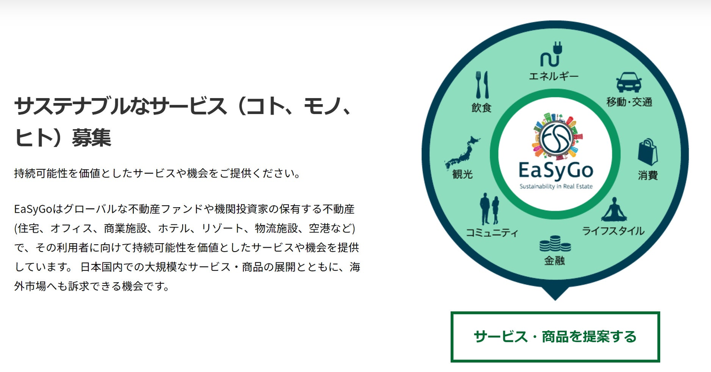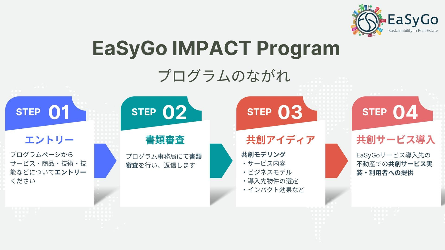 「EaSyGo IMPACT Program」は、EaSyGoサービスが導入されている不動産を起点に360°のライフスタイルサービスを一緒に提供するパートナー企業との共創プログラムとして、食、移動、エネルギー、ウェルネス、防災、教育、などサステナビリティを価値に連携するサービスや商品を募集します。