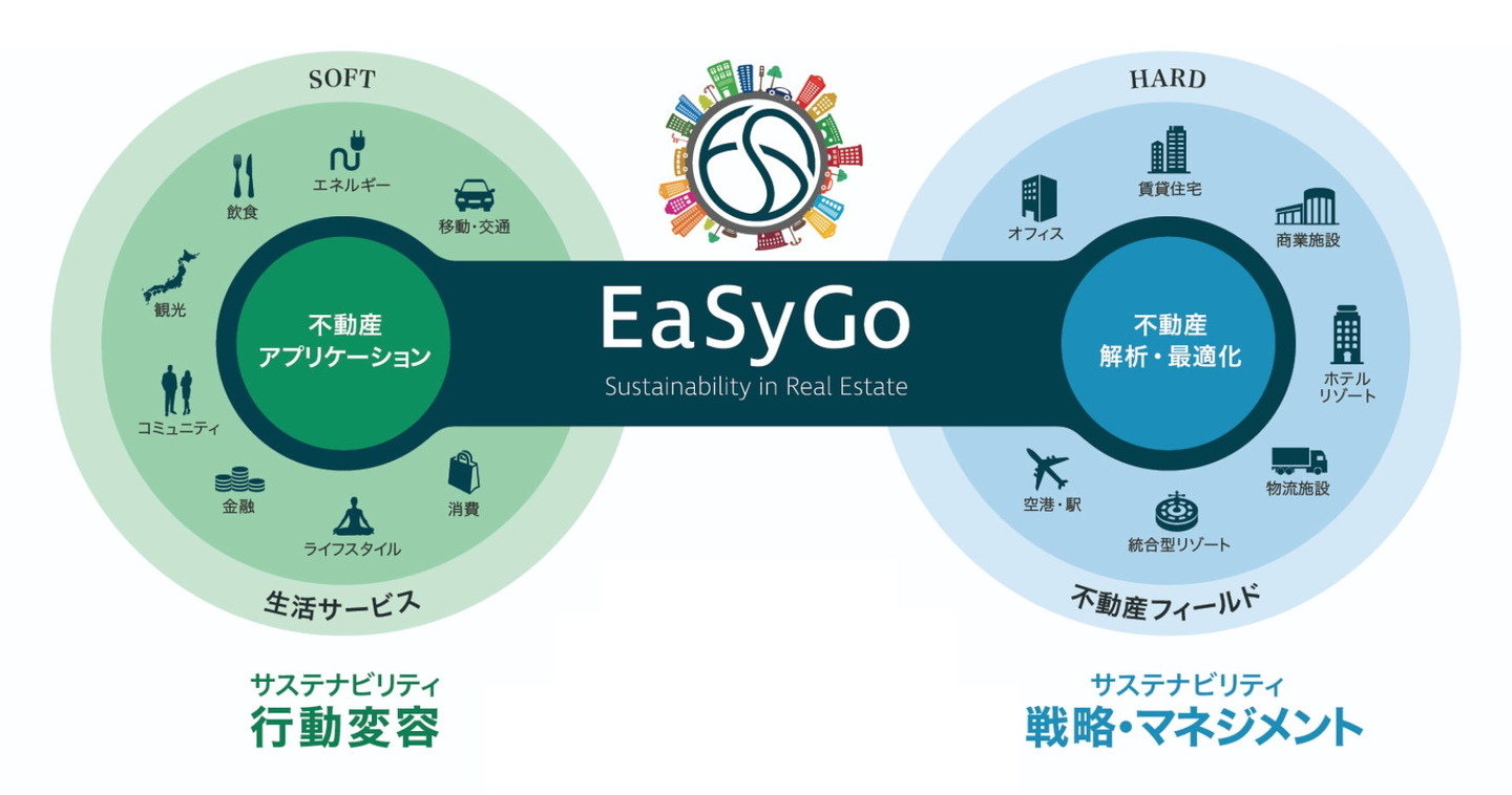 EaSyGoサービスは国内・海外のグローバル機関投資家が保有する住宅、オフィス、商業施設、リゾートなどに導入されており、その不動産を利用する「住宅に住む人々」、「オフィスで働く人々と企業」、「商業施設を利用する人々」、「リゾートに訪れ宿泊する人々」、「その地域コミュニティ」などに向けた持続可能性を価値とする様々なサービスを提供しています。