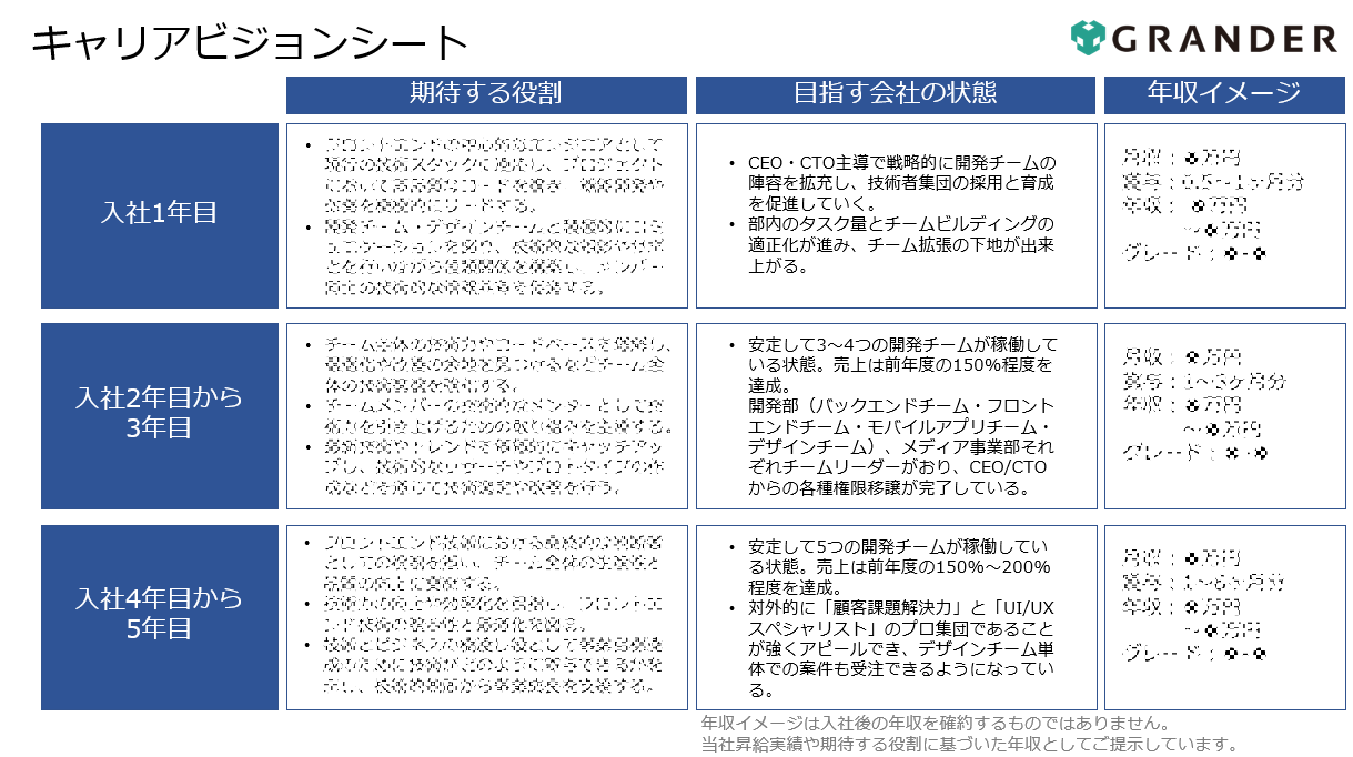 Granderでは、メンバー一人ひとりが主体的にキャリアを描けるよう、短期・中期・長期のキャリアパスを整理した「キャリアビジョンシート」を導入しています。