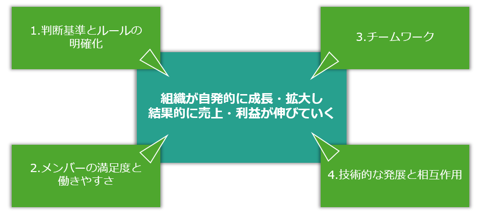 私たちが目指すのは、「組織が自発的に成長・拡大し、結果的に売上・利益が伸びていく」組織です。
