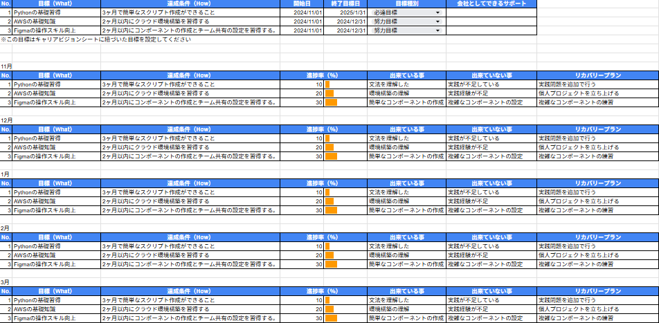 ただ作って終わり、ではありません。このシートをもとに、各自が学習目標を立て、毎月の振り返りを行うための「キャリアアップアクションシート」を活用し、取り組んだことと成果を可視化しています。