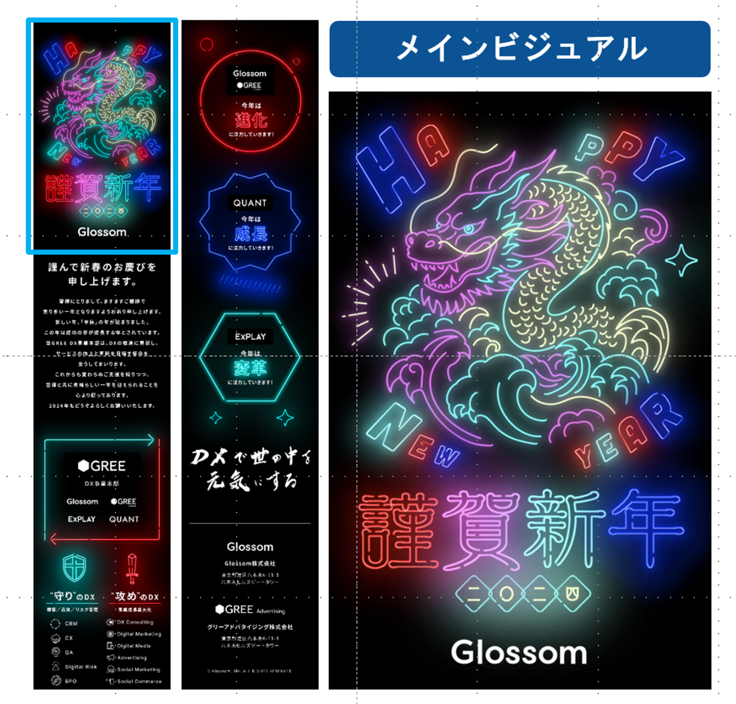 昨年の年賀状プロジェクトチームから引継ぎを受け、まずはメインビジュアルとコンセプトの企画に取り掛かりました。2024年の干支は甲辰(きのえたつ)と言い『成功という芽が成長していき、姿を整えていく』といった意味合いを持っているそうで、事業が目指していく姿と共通しているということから、甲辰の意味を元にメールのメインビジュアルとなるイメージのディスカッションを重ねていきました。