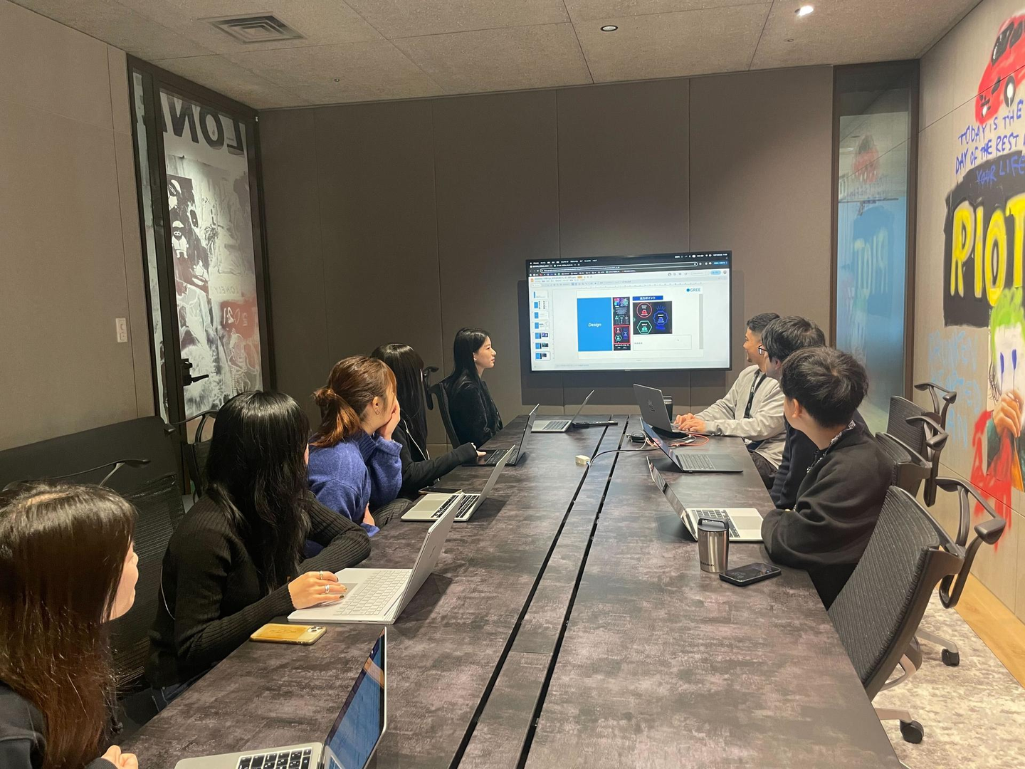 デザイン会社からメインビジュアルの候補となるグラフィックが上がってきたので、それを元にGREE DXの代表陣にどのメインビジュアルで打ち出していくかのプレゼンを行いました。代表陣へのプレゼンということで最初は緊張の面持ちだったメンバーも、「このデザインかっこいいね!」「ここ、こうしたらもっといいんじゃない?」「プロジェクトメンバーの一押しは?」などのフィードバックを受けながら、デザインに込めた思いを嬉しそうに伝える姿が印象的でした。
