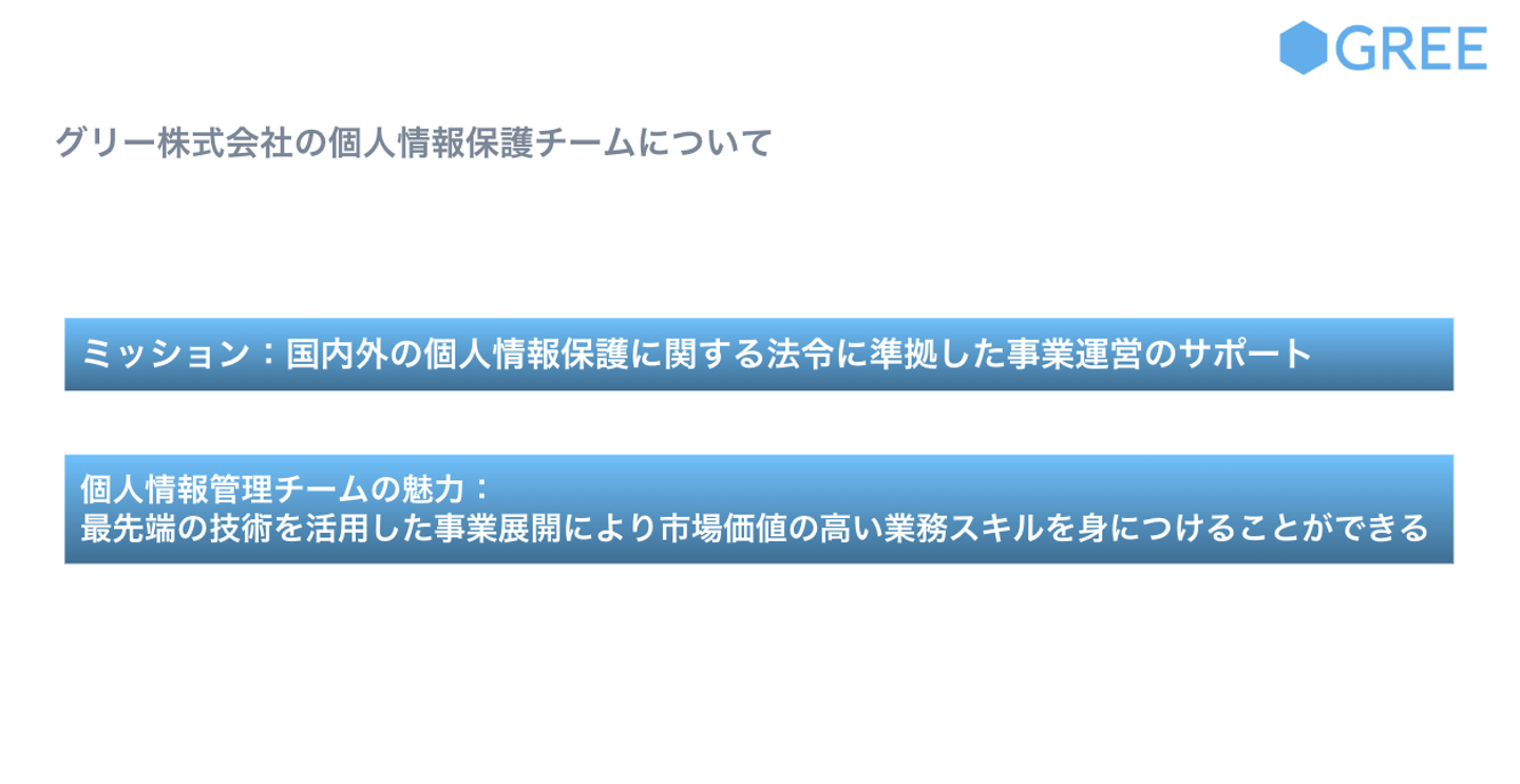 特にグリーはグローバル展開をしているため、国内法だけではなくGDPR(EU一般データ保護規則)の知見も必須となります。