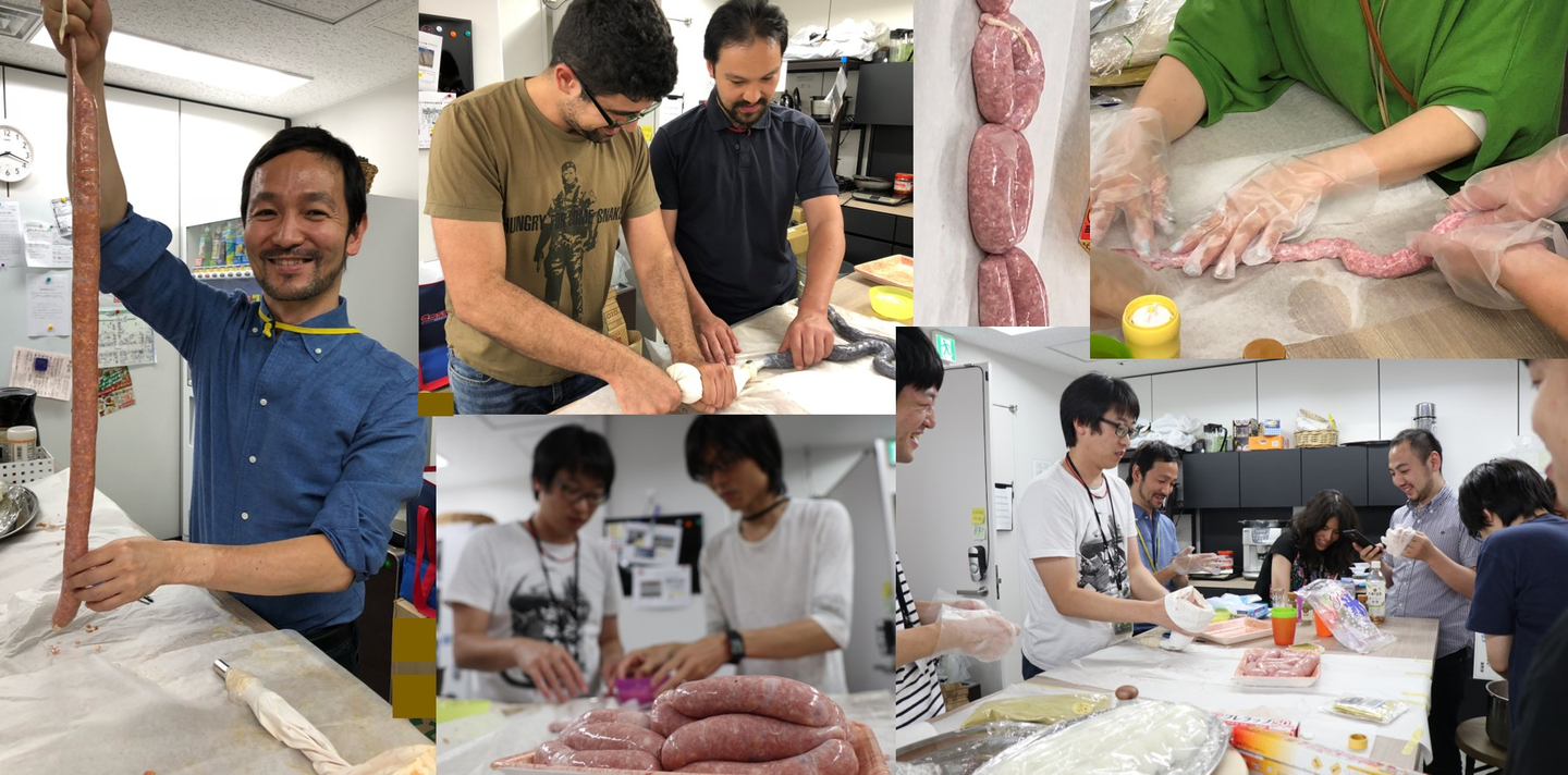 腸を洗って→肉をこねて→ひたすら詰める!なお今回の腸詰監督はファームウェア開発チームの横山。