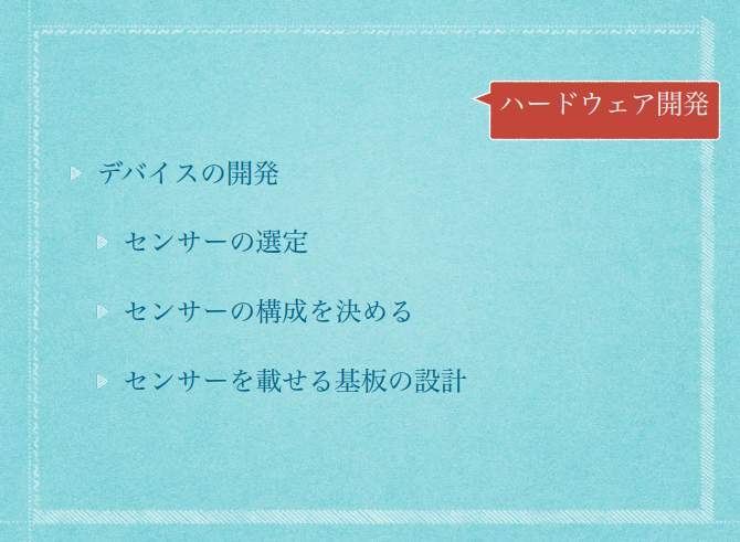 それをもう少しブレイクダウンすると、デバイス開発はセンサーの選定からはじめて、選定したセンサー構成を決め、そのあとにそれらのセンサーを載せる基板の設計をやるっていうのが大まかな順番です。うちの会社はセンサーとかは基本買ってくるので、いろんなところから出てるセンサーを比べてみたりもします。いわゆるハードウェア開発のとこっすね(外装とか、ちょっと詳細なとこは飛ばしてますけど気にしない!)