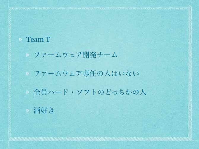 そんな感じの仕事をしているTeam Tですが、要はファームウェア開発のチームでありながら、ファームウェアだけ書いている人はいない、っていうのが現状です。みんなハードでメカ・電気回路作ったり、OSのところを書いたりする人が兼任してます。あと、みんなお酒は好きです。