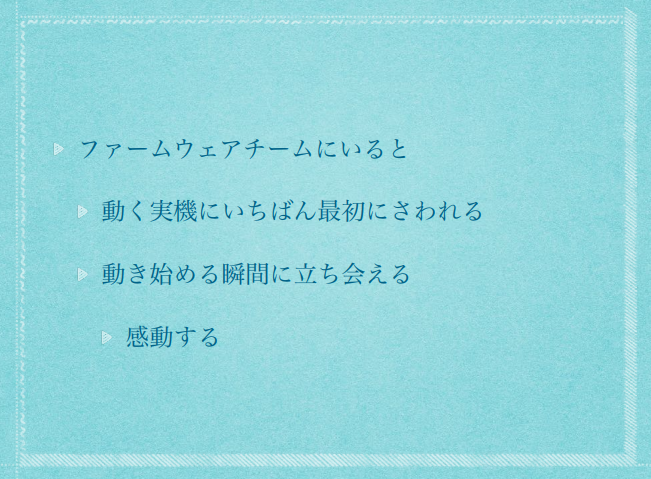 なので、思想はそこまで変わんないからみんなやればいいのになって思ってます。意外とアプリやっててよかったなぁって思ってるのは、アプリ層の実装を意識して設計ができるので、レイテンシーとか、通信速度を減らしたり、逆に冗長にしたりしてどう表現されるかってところができる気がしてます。あと最後に、ファームやってよかったなってことは、やっぱり動くロボットに一番最初に立ち会えるというか、自分が初めて動かすひとになるので結構感動しますね。漫画とかでも研究所で初めてろぼっとが目覚めるとかあると思うんですけど、あんな感じに近いです。