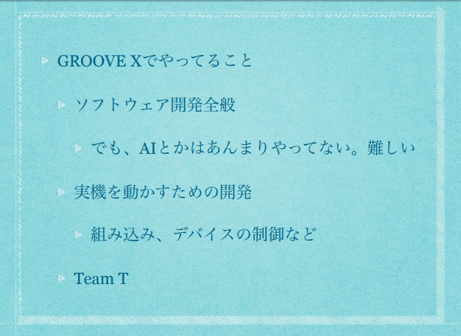どちらかっていうと実機=モノとしてのロボットを動かすことをやってて、社内ではチームTって言われてます。チームTのTは竹上のTです。SW的な視点でファームを書く人がチームで一人しかいなくてさみしいです。だれか入ってください。