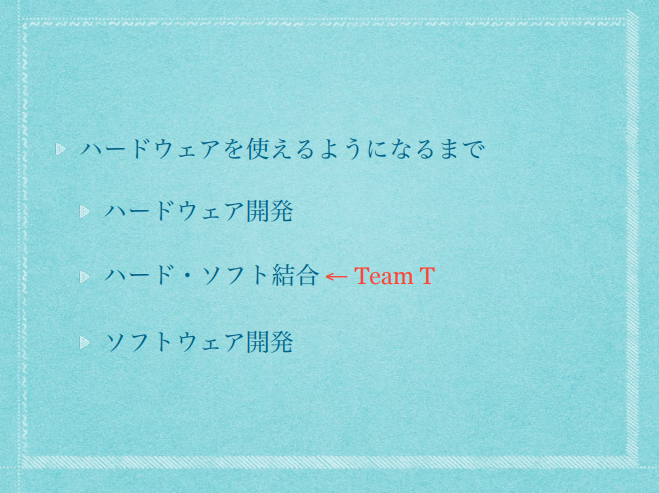 で、ハード・ソフト結合をやるのがぼくらTeam Tって感じです。