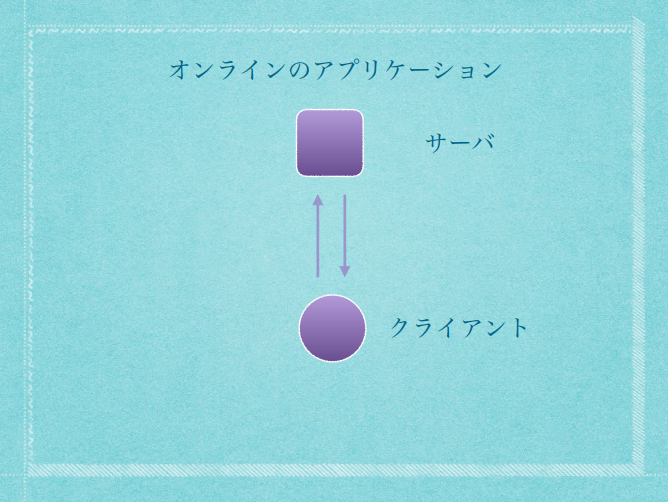 さっきも書いたんですが、アプリやってる人ってファームとか難しいって思ってるんじゃないかなって考えています。でも、意外と似てる部分もあって、オンラインのアプリケーションだと、クライアント(みんなのパソコンとかですね)があって、サービスする側にサーバーがあって、その間をデータが行ったり来たりしています。