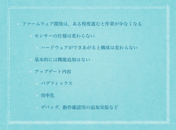 なんでかっていうと、ファームってずーっとやっている仕事って感じではないんですよね。ハードってセンサー決まっちゃえば仕様ってめったに変わんないし、構成を変えたりすることも少ないんで。あと、いまは開発期だからっているのもあるんですが、基本的に機能追加は今のところやってないです。なので、新しい仕事が増えていくというよりは、バグをつぶしたり、効率よくしてヌルヌル動くようにしたりするのがメインです。