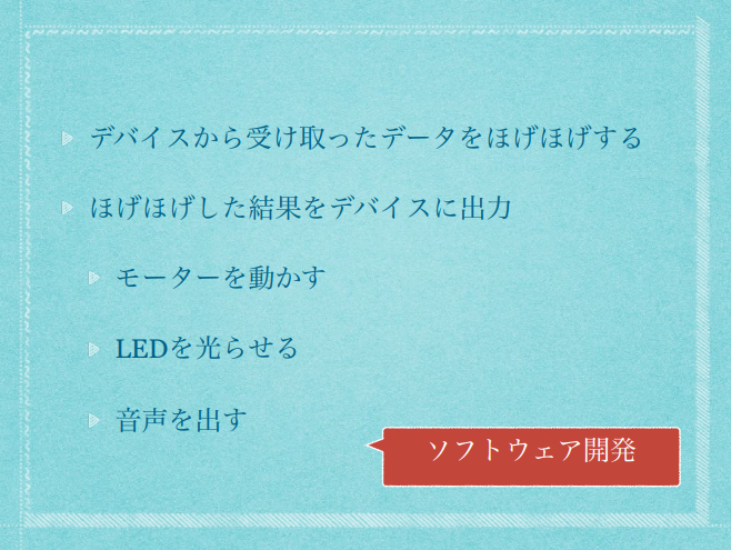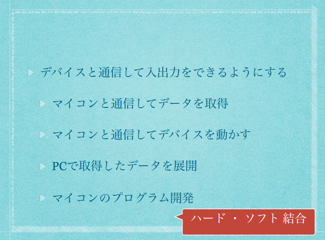 そのあとにデバイスと通信して入出力をできるようにする、ってところがハードとソフトを結合させるところで、まずセンサーとマイコンに通信してもらってデータを取得したり、マイコンと通信してデバイスを動かしたり、あとはマイコンのプログラムを開発します。