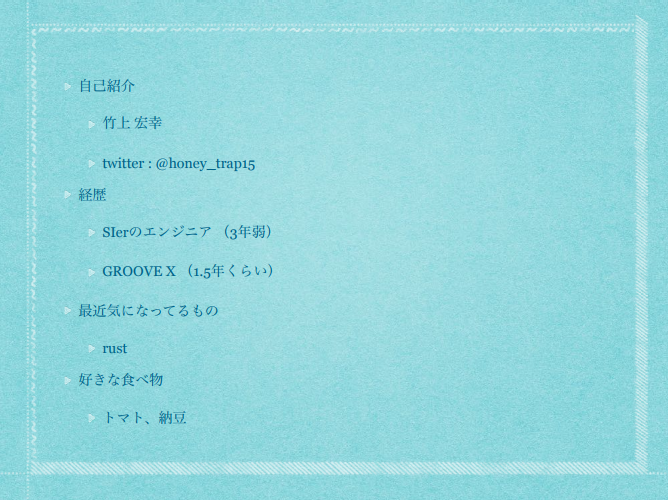 改めまして、竹上 宏幸(たけがみ ひろゆき)です。ツイッターとかやってるんで、ぜひフォローしてください。前はSIerとして主にウェブ系とか、サーバーサイドの仕事とか、なんでもやってて、緑のリスの会社(って古いかな)のサイト関連とかのお仕事とかもやってました。