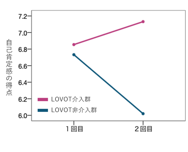 LOVOT介入群の子どもたちには自己肯定感の低下が見られず、2回目テスト時に非介入群との有意差を確認できました。