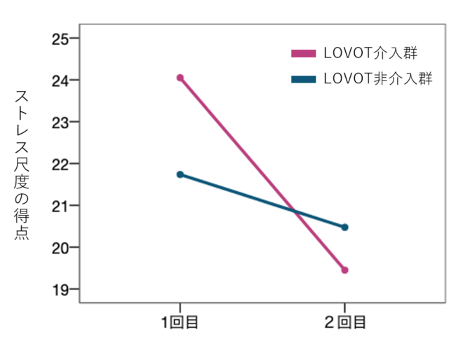 LOVOT介入群では、1回目から2回目にかけて保護者のストレスレベルが大きく低下していたことが確認できました。