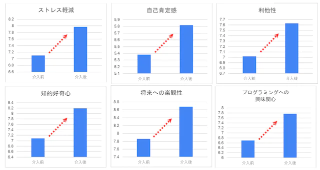 ・高学年でも「ストレス軽減」、「自己肯定感」、「利他性」、「将来への楽観性」、「プログラミングへの興味関心」、「知的好奇心」が大幅に増加。