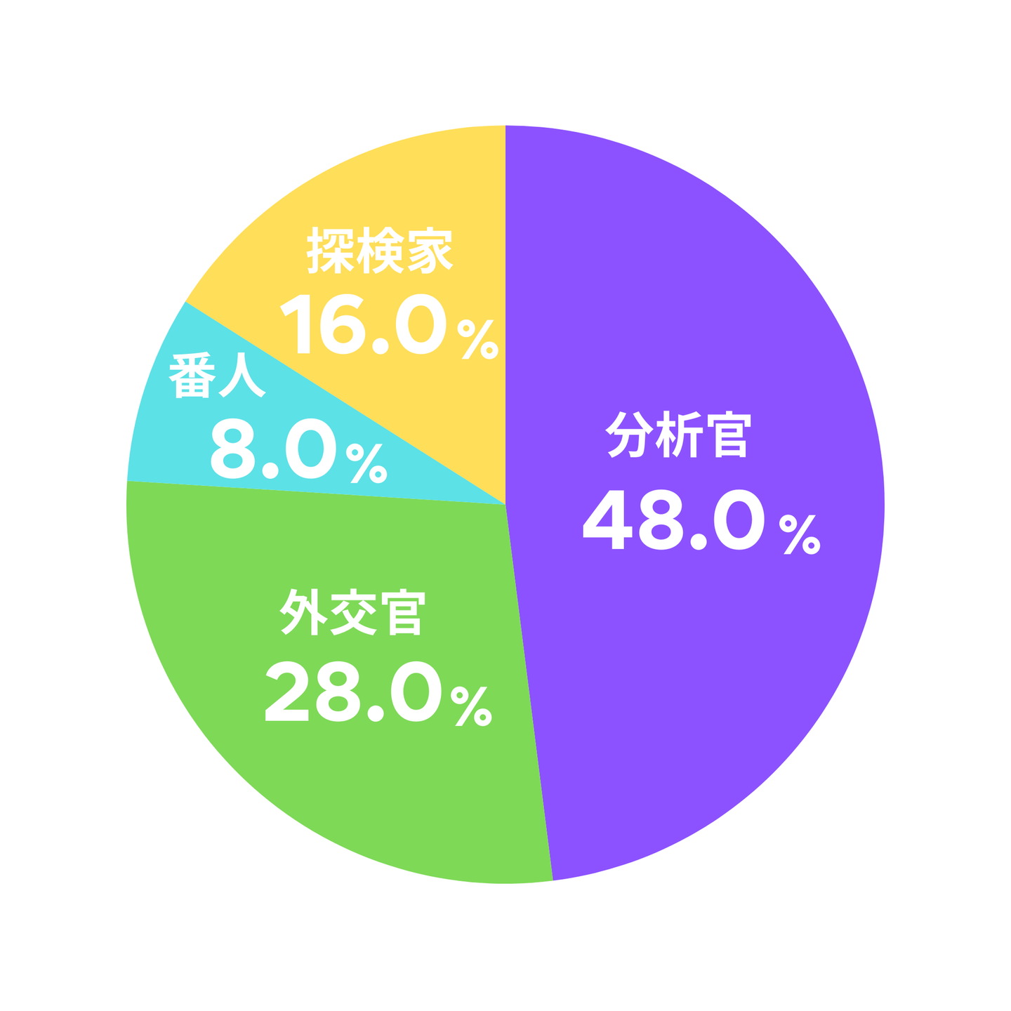 多い順に「分析官」「外交官」「探検家」「番人」という結果になり、「分析官」が約半数を占めています。「分析官」は【理論的で分析的な思考を持つ。合理的な判断を重視し、目標に向かって効率的に行動することを得意とする】と言われているので、とてもコンサルティング会社らしい結果になったなーという印象です。ちなみに日本人のグループ別の結果は「外交官」が最も多く、40%ほどを占めており、当社で最多の「分析官」は19%と少数派のようです。
