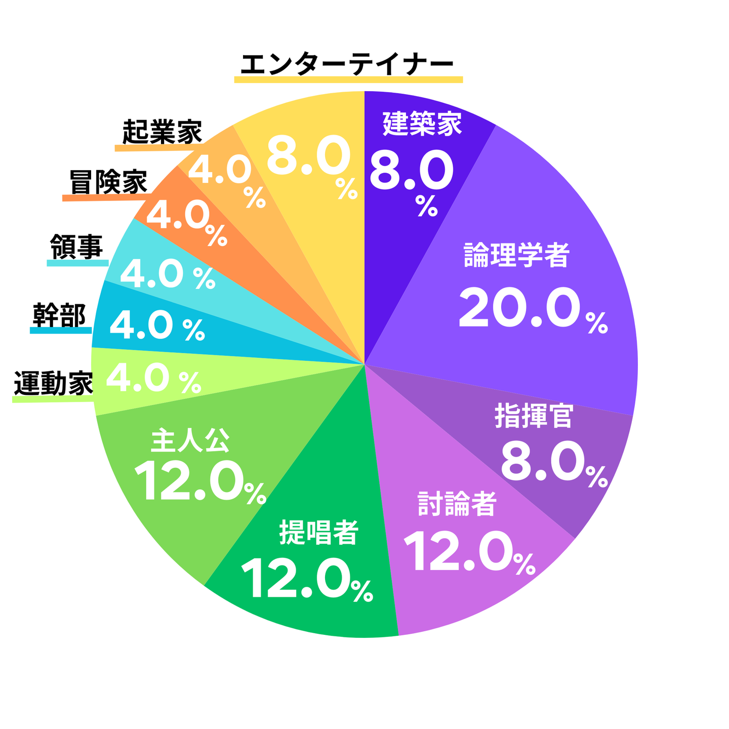 日本人のタイプ別結果を調べてみると、「仲介者(約16%)」「運動家(約14%)」「論理学者(約8%)」という順で多いようです。