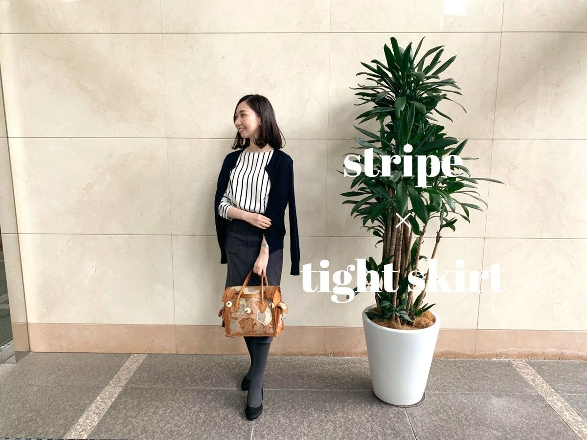 最近やや太り気味のため、ストライプとタイトスカートで縦線意識
