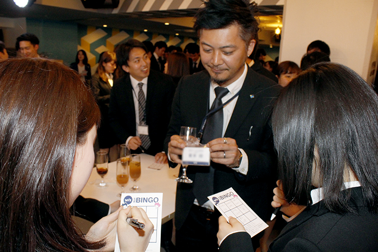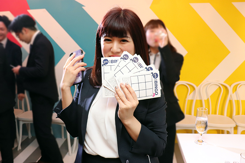 支社紹介の後は「自己紹介ビンゴゲーム」です。ルールはとても簡単で、新入社員は9個のマスが描かれたカードを手に、Wiz社員や他の支社の新入社員と自己紹介を行います。自己紹介をした人の名前をカードに書き、9個のマスを埋めたらビンゴ開始!くじを引きで引かれた名前が書かれたマスをチェックし、縦・横・斜めの3マスが揃ったらビンゴです。