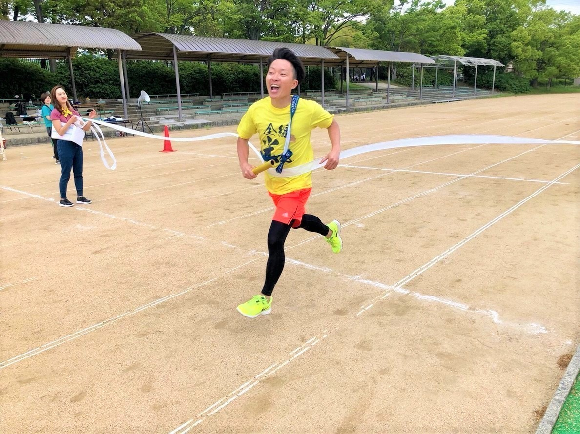 男女混合全員リレーです。持てる力を振り絞り、一人ひとりの想いを繋ぎます。アンカーが走る距離はなんと800m!!こちらは黄色チームの門松課長が1位でフィニッシュ!!