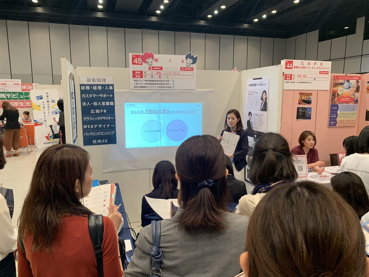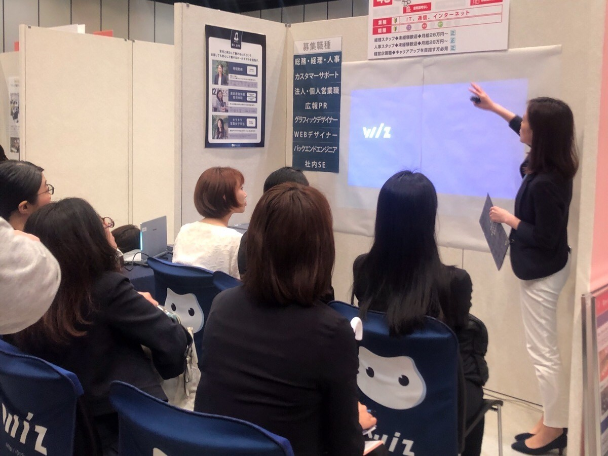 Wizのブースでは「Wizを語るプロ」が参戦したので、早速本気の会社説明会がスタート!有難いことに、Wizのブースは初回の会社説明から人だかりができました。Wizは男女比が約5:5で男女問わず活躍している方が多い会社であるうえにしっかりとしたサポートもありますので「長く働きたい!」と考える方にはおすすめの環境ですよ!
