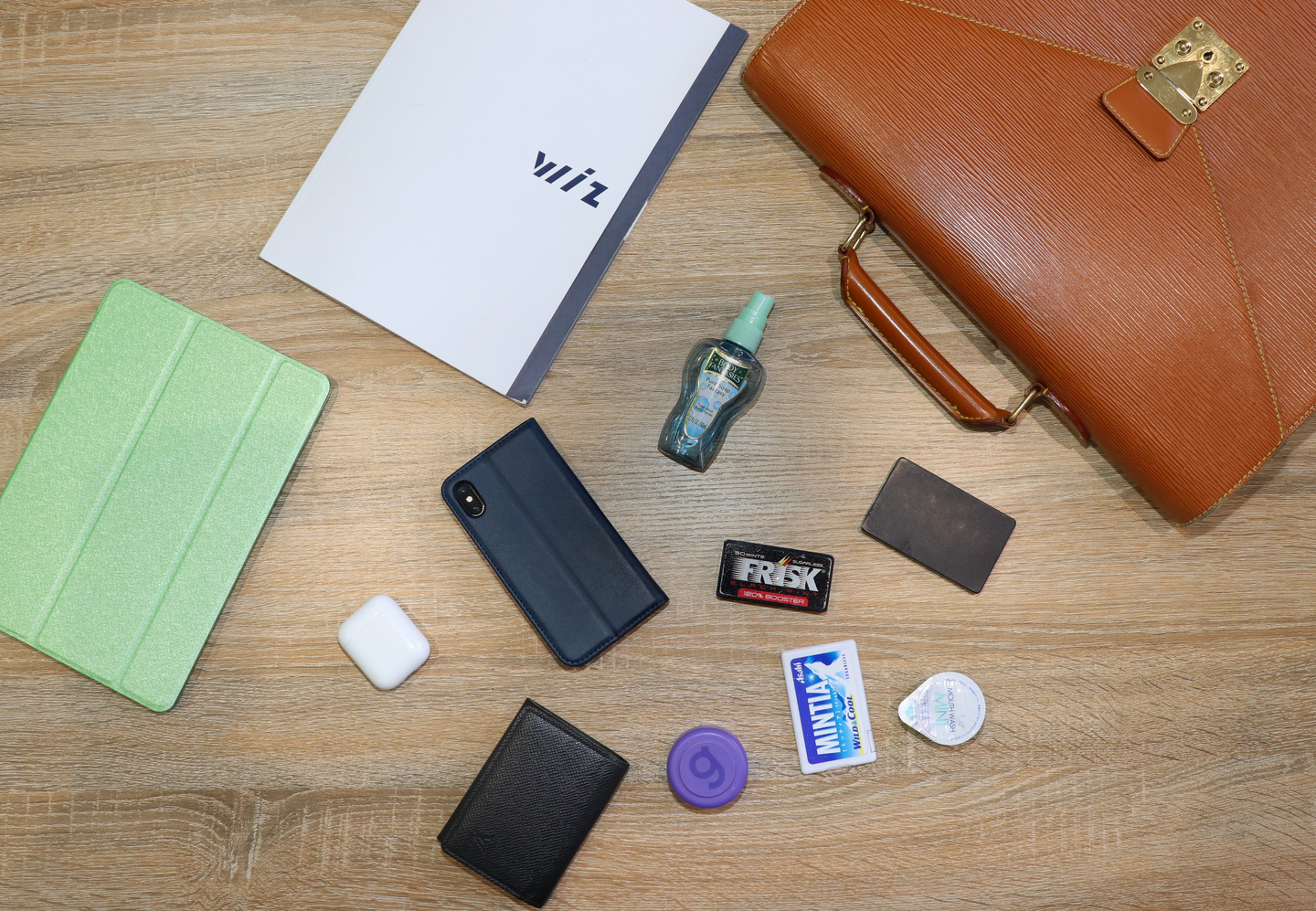 通勤バッグの中身がこちら!バッグと名刺入れはルイ・ヴィトン。ワイヤレスイヤホンやiPad、充電がなくならないようにモバイルバッテリーなど、移動中でも仕事が出来るような必要最低限のアイテムをそろえていました。フレグランススプレーやヘアワックス、マウスウォッシュといった身だしなみグッズもしっかり持っています!