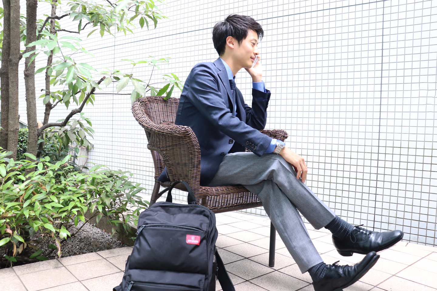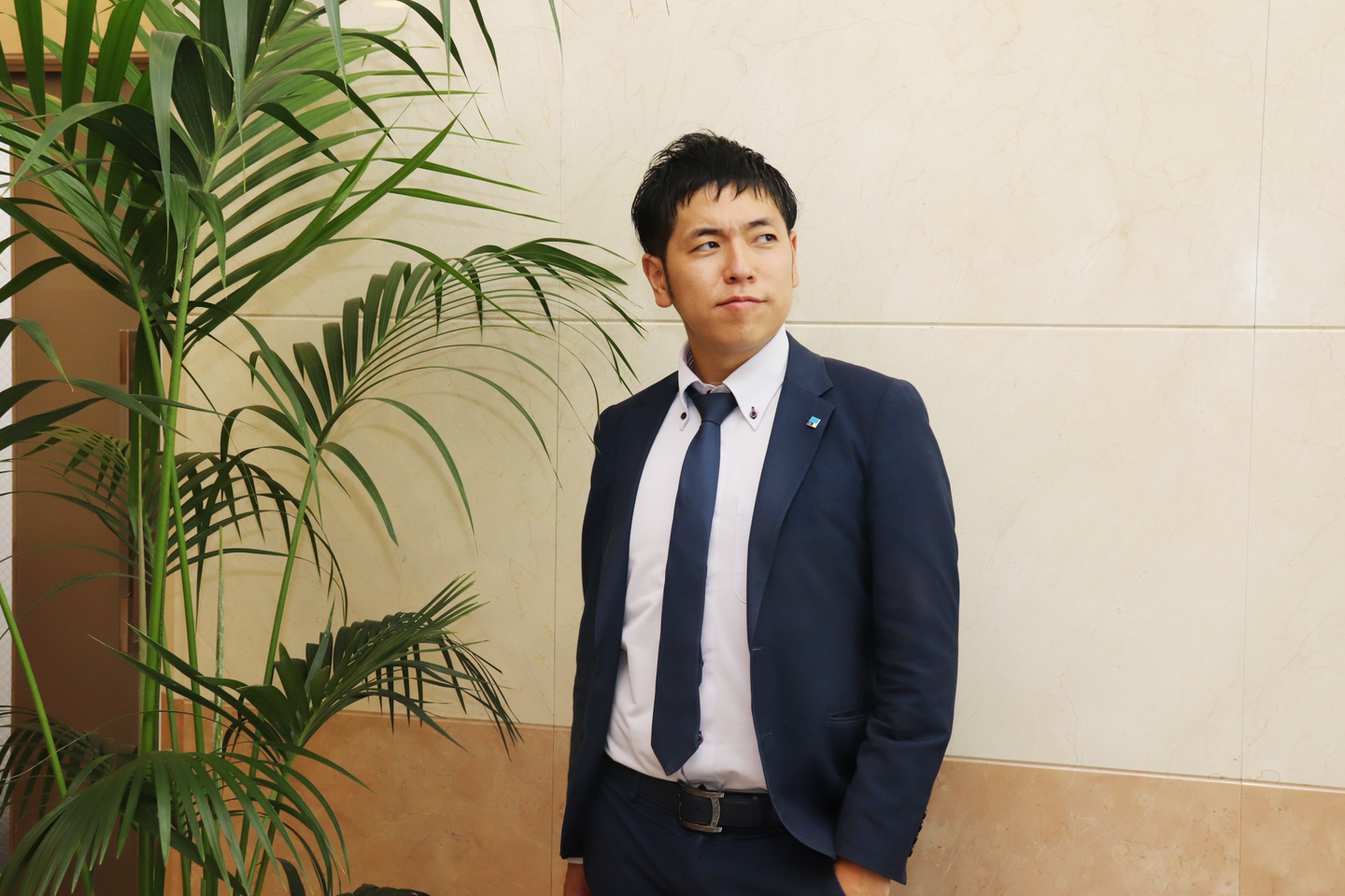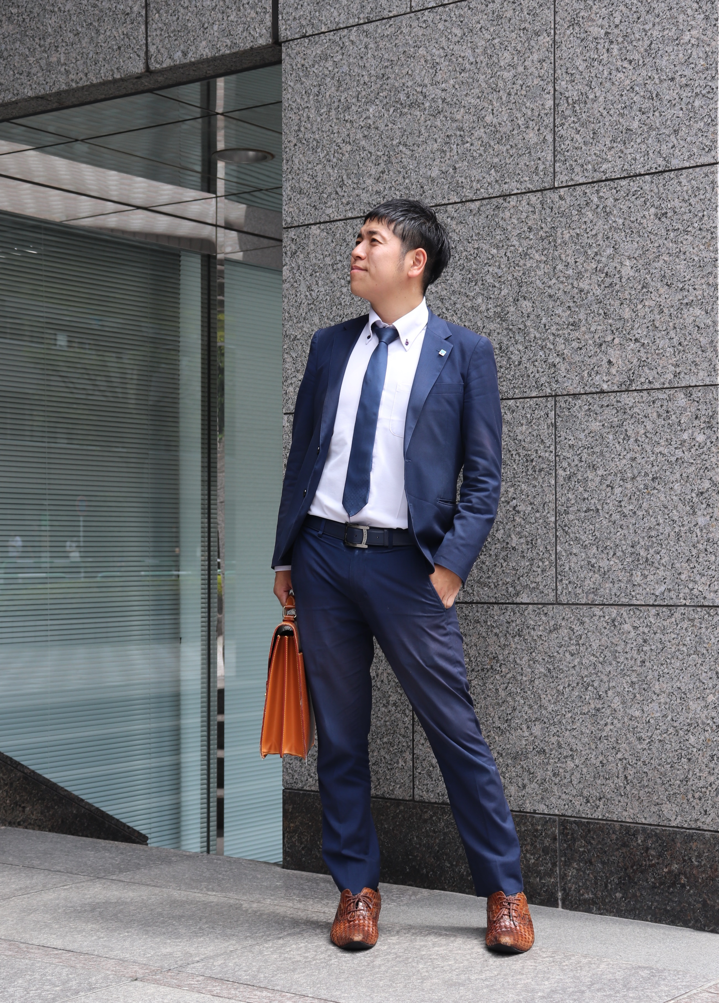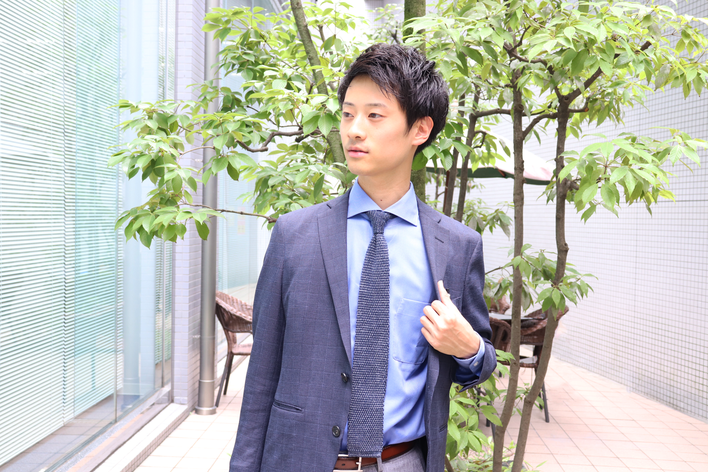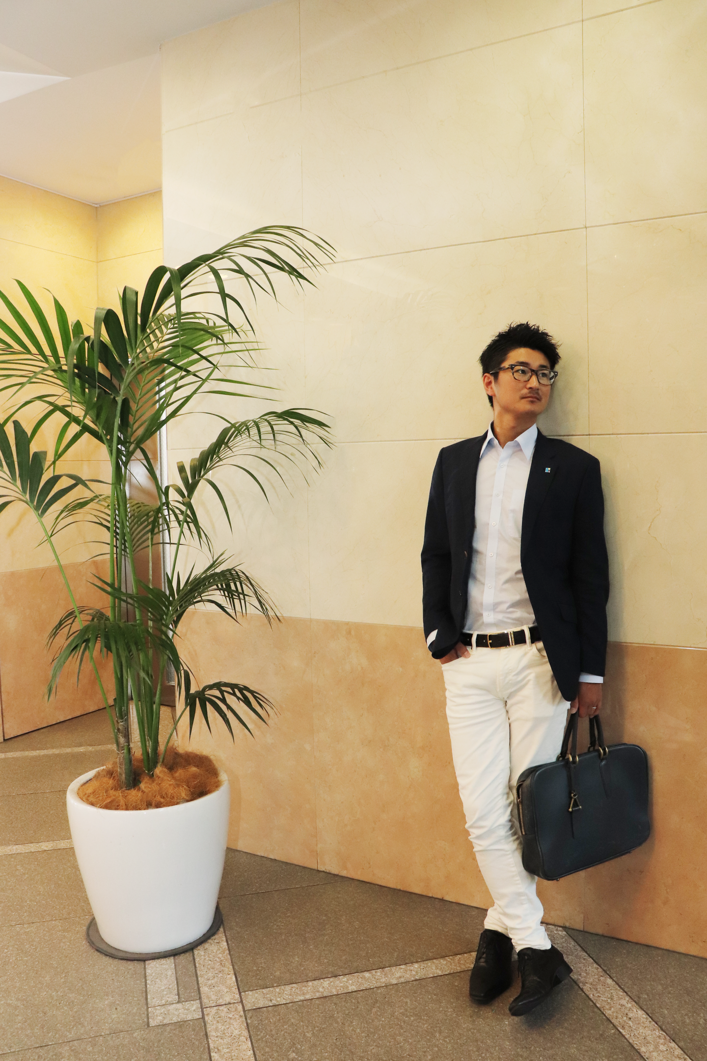 Wizの立上げメンバー12名のうちの1人として参画し、営業職を経て、現在は人事採用部の次長として福岡支社をベースに全国にある支社へと日々飛び回っていらっしゃいます。そんな山内次長は人望も厚く、全国の支社にファンがたくさんいるといっても過言ではありません!この日は東京本社に出社。スーツを選ぶときの基準は「さわやか」がテーマ。少しカジュアルなスーツスタイルで、ホワイトのパンツがよくお似合いです!