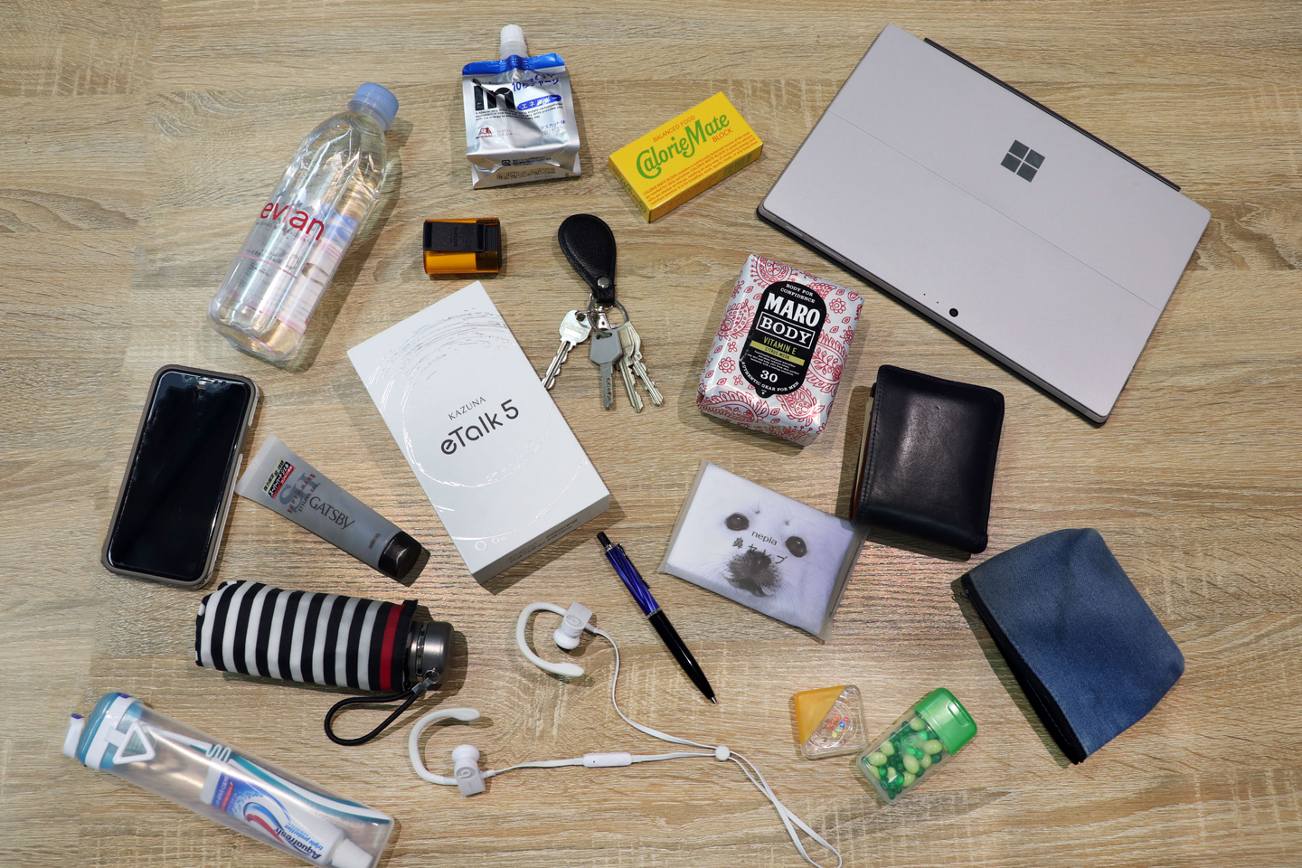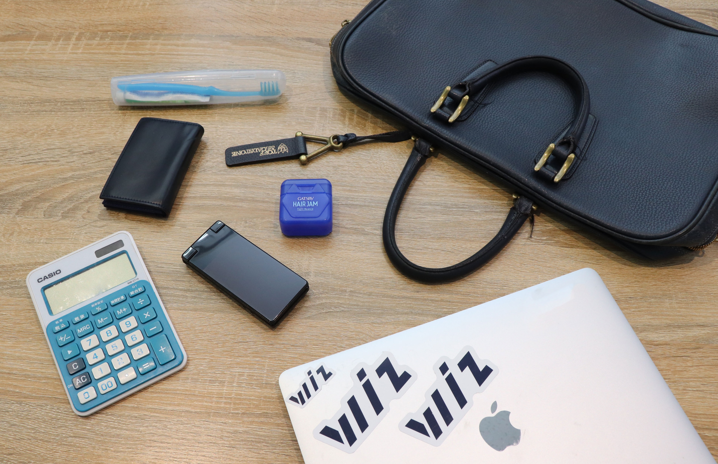 客先への訪問で社外に出ている時間が多いという山田課長代理は、軽め素材のリュックを通勤に使用。アイテムを選ぶ際の基準は機能性重視。急な予定が入ってオフィスに戻れなくなった際やスケジュールの関係でランチが食べれないときのためなども、「これさえあればなんとか生きていける」アイテムを備えているそう。歯磨きセットやヘアスタイリング剤、ボディシートなど、きちんと身だしなみに気を遣っている印象です。