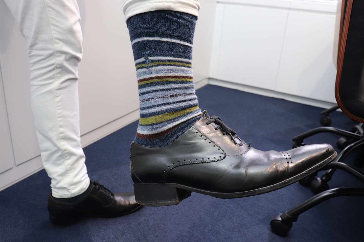 通勤バッグの中身がこちら(写真:上)。アイテムはかなりシンプル!オリジナルのブランドタグがとても可愛く、ディティールまでこだわっているバッグはなんと社長からの誕生日プレゼントで、毎日欠かさず使用しているとのこと。また、バーニーズニューヨークのブラックの名刺入れやこの日着用していた靴下(写真:下)は、Wizの従業員からの誕生日プレゼント。コーディネートの写真で着用しているベルトは奥様からのプレゼントと、贈られたプレゼントはずっと大切に使用しつづけるお人柄ということが分かりました!