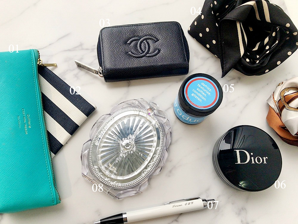 01.ペンケース 02.ポーチ 03.ミニ財布 04.スカーフ 05.ヘアワックス 06.ハイライト 07.ペン 08.手鏡