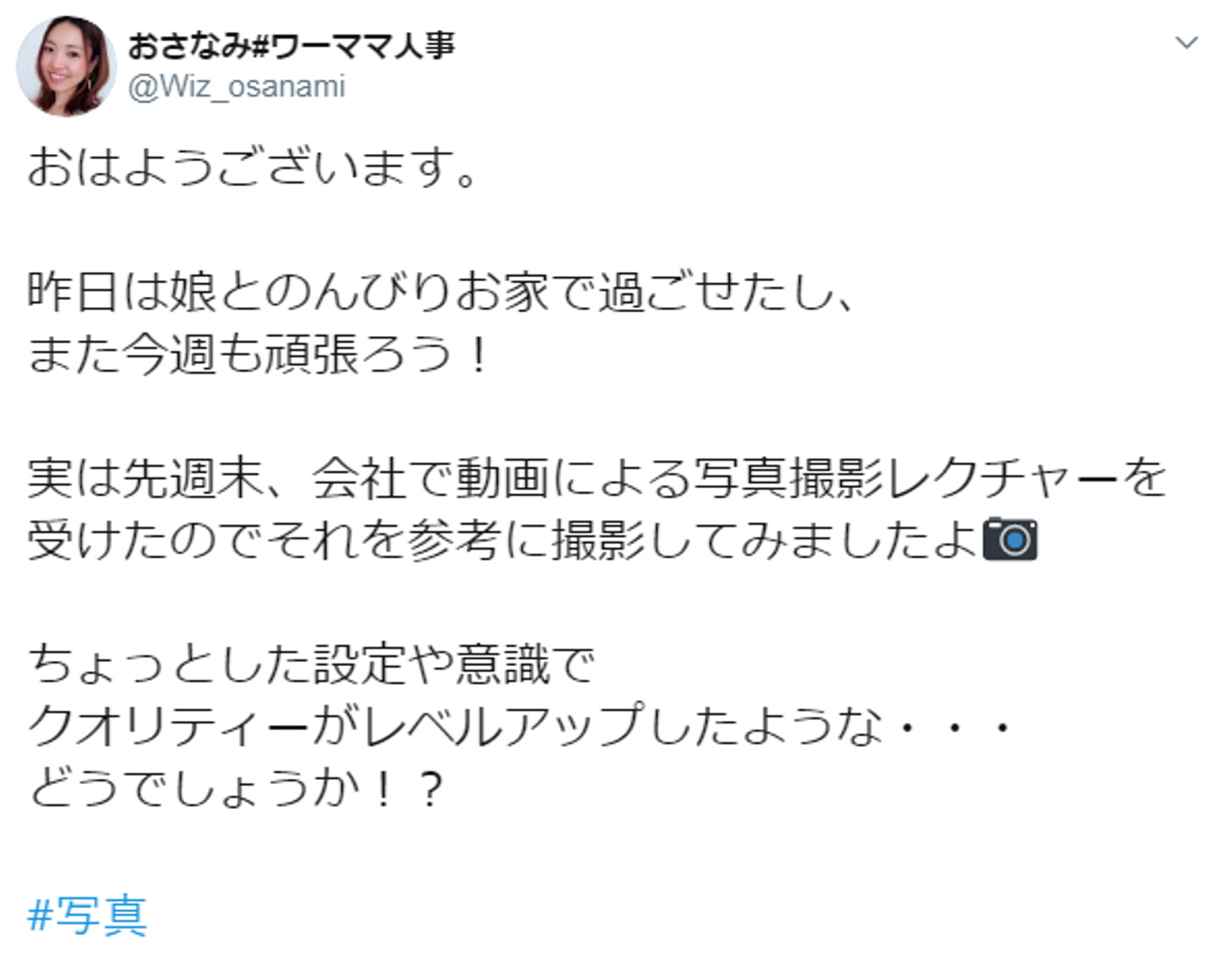 S氏が前職ではカメラマンをしていたということもあり、手持ちのスマートフォンでキレイに撮れるコツなどを短時間の動画で配信。Wizの人事部全体で写真撮影のレベル底上げに取り組んでいます。