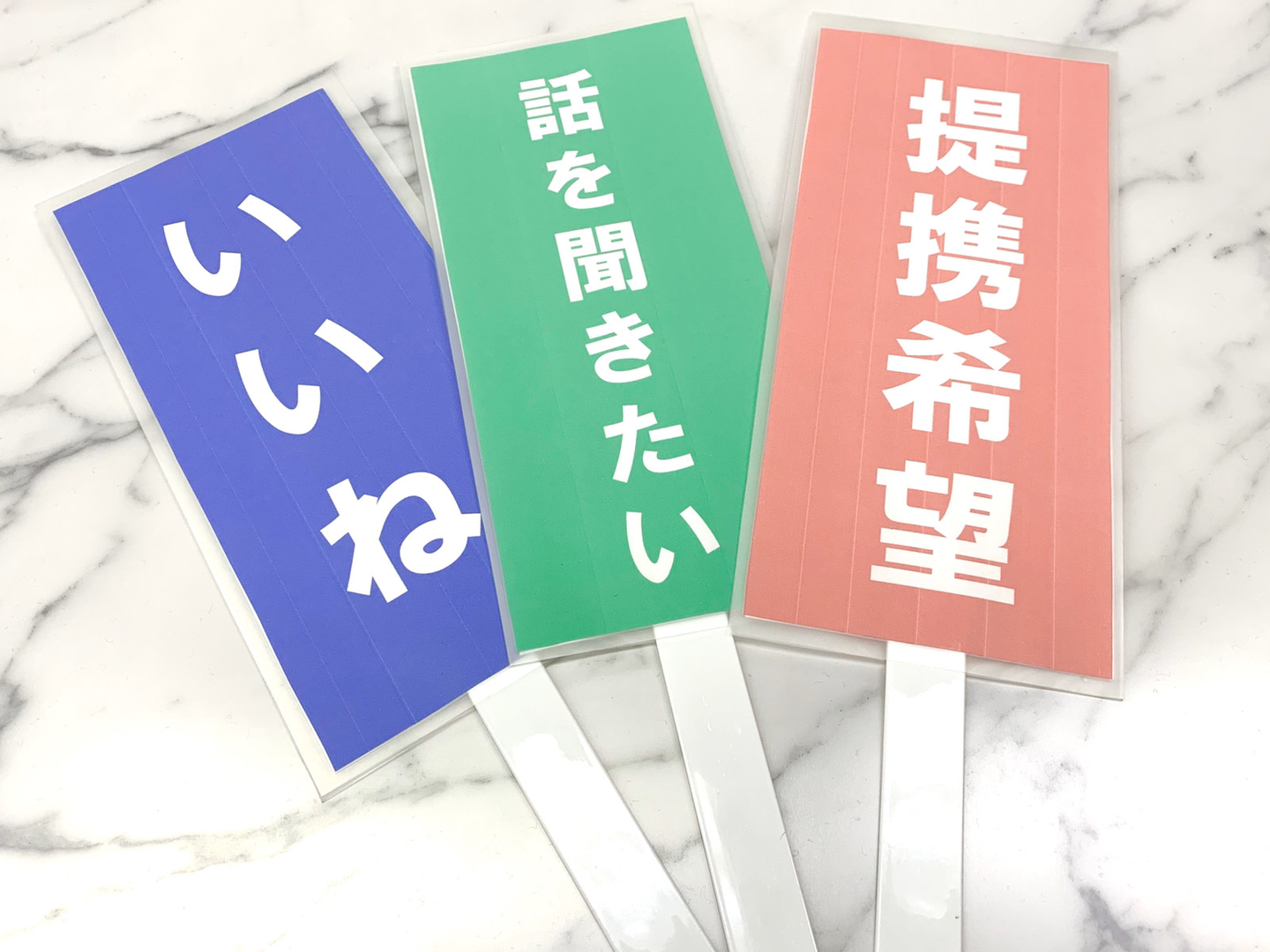 そして新しいことがもう1つ。参加者に一人ずつ話していただいたら、それに対して社長陣が「提携希望」「話を聞きたい」「いいね!」の札で判定をするというシステムを取り入れました。