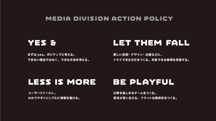 また、2020年メディア本部は「新しい組織に生まれ変わること」を目標とし、自分自身で考え、最適なトライを実行する組織にしていきます。その実現の一貫として、新たに誕生したメディア本部の行動方針が公開されました。