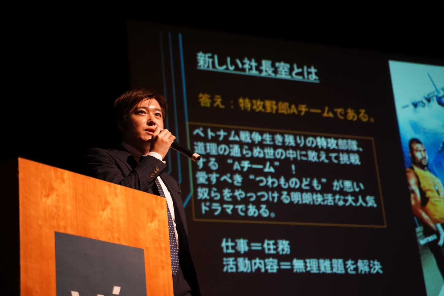 プレゼンでは映画やアニメに例えて分かりやすく説明してくれたのですが、「今までの社長室=御庭番衆(※)」つまり、「仕事内容=???」だったと問題提起し、「これからの社長室=特攻野郎Aチーム」でいくと宣言されていました!